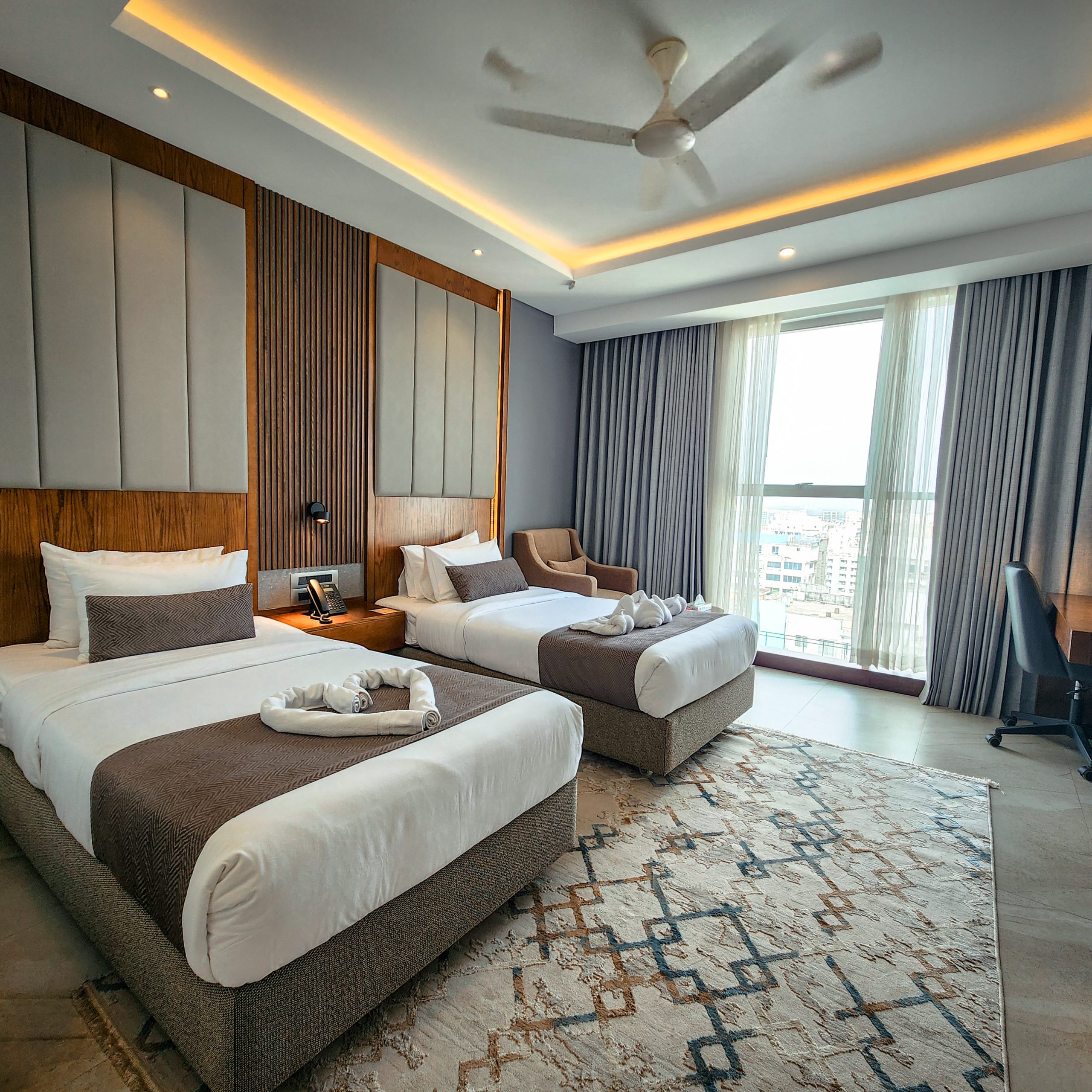Indulge in luxury and sophistication in our 350-square-foot Executive Twin Deluxe Room, where comfort meets elegance. Featuring a spacious king-sized bed and breathtaking city or sea views, this room offers the perfect sanctuary for relaxation. Thoughtfully designed for up to two adults , it combines refined style with modern amenities to ensure a truly memorable stay.