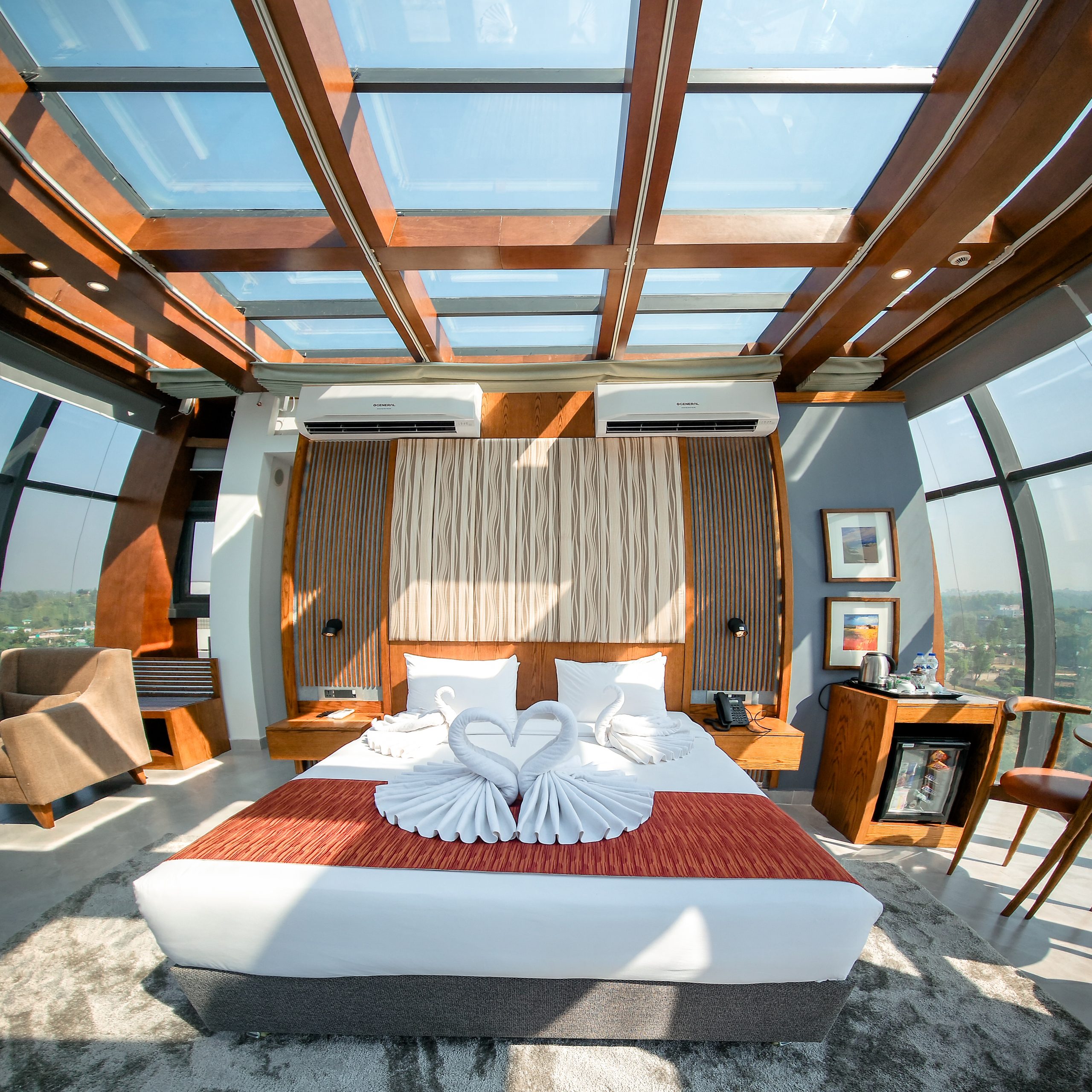 Experience serenity above the city at Windy Terrace’s Sky Blue (Glass House) Room.