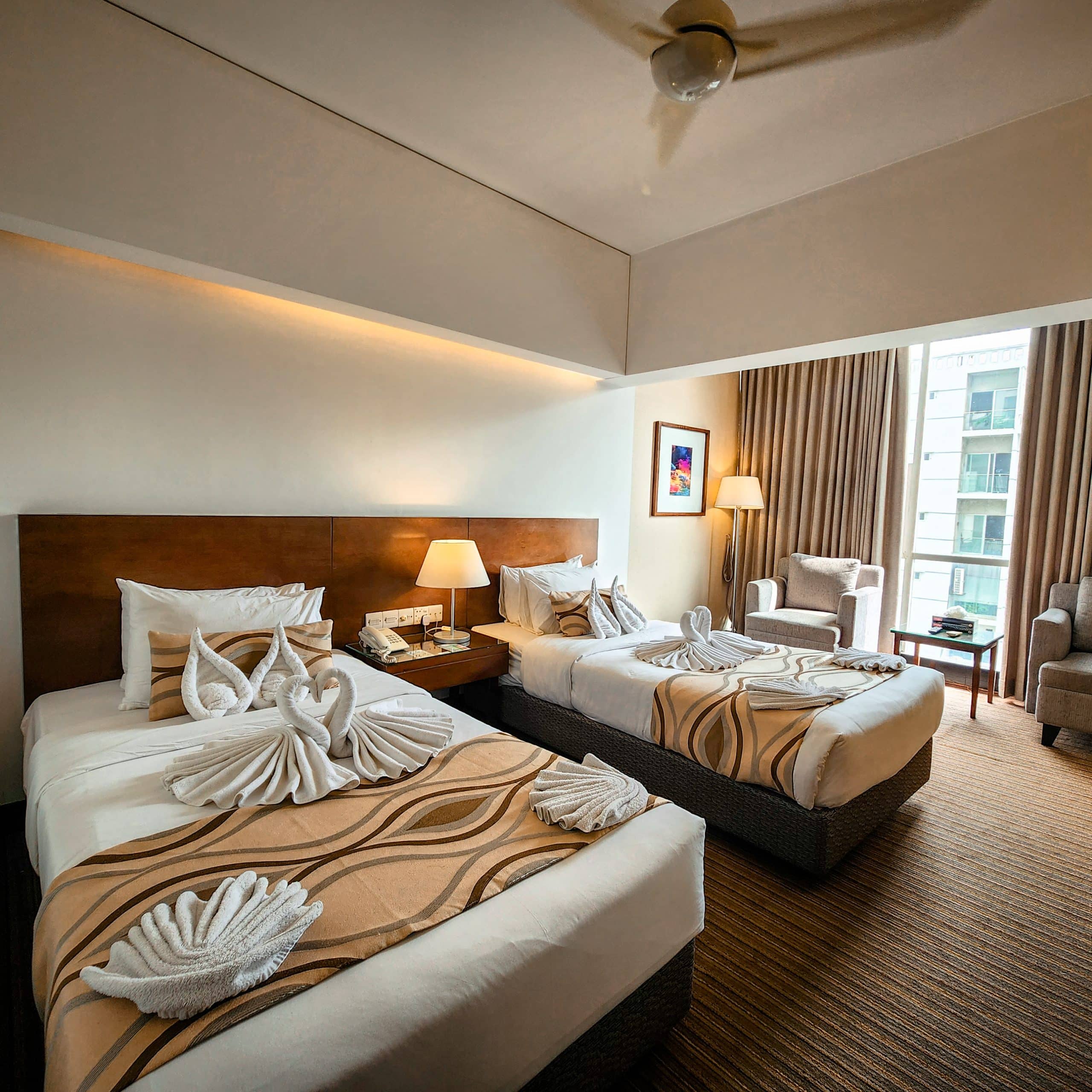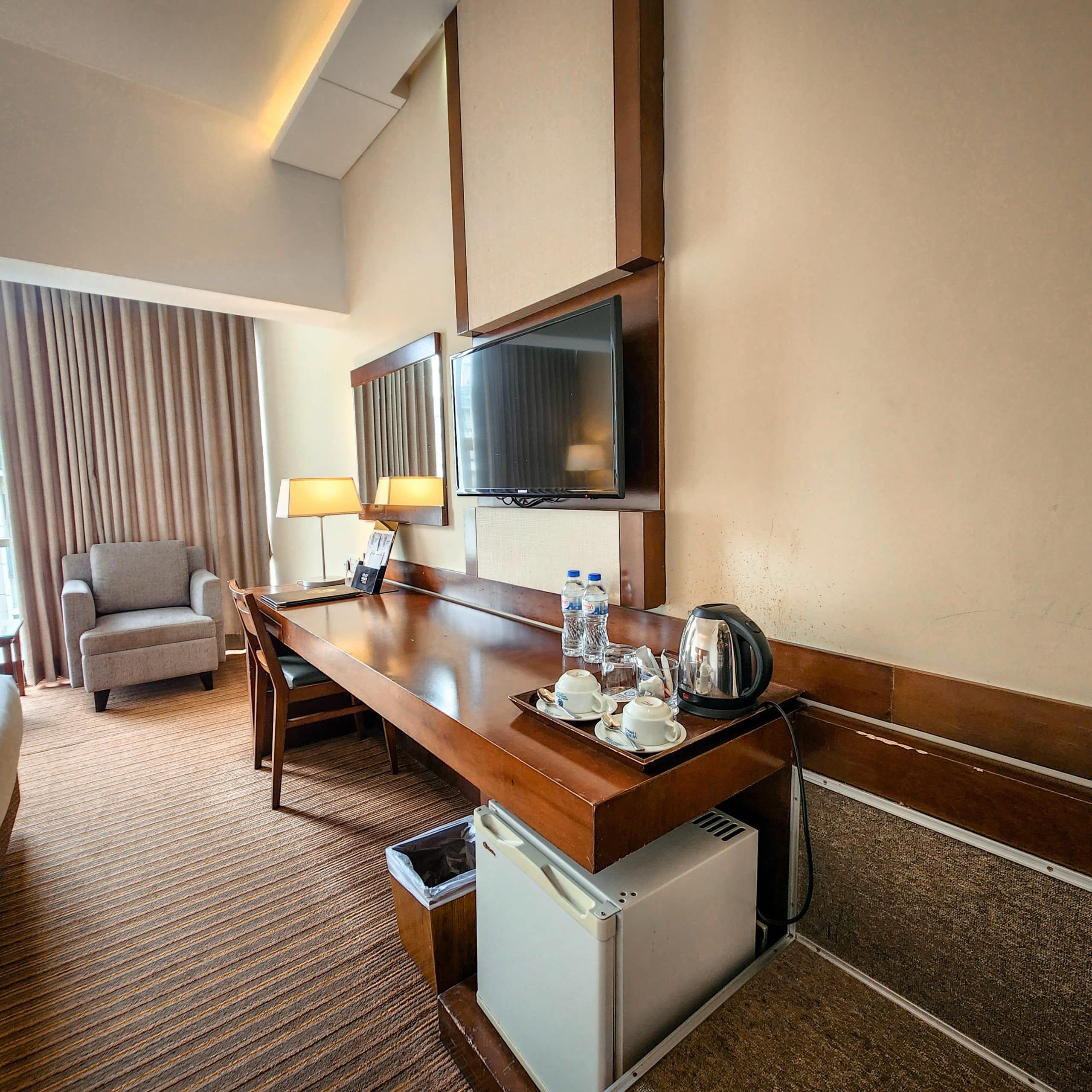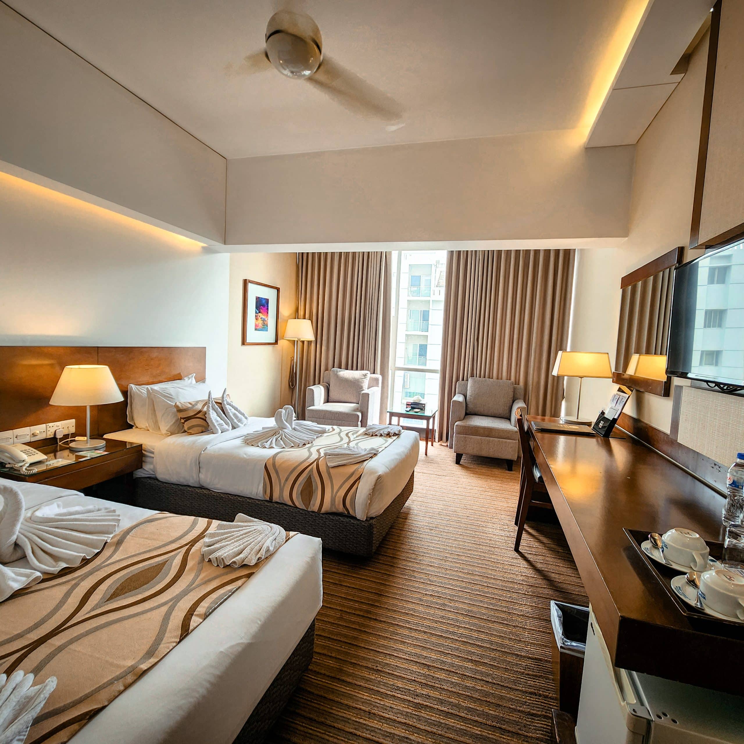 Indulge in a homely ambiance where every room is tastefully decorated with a soothing palette of soft colors, designed to make you feel completely at ease. As you step inside, you’ll be welcomed by a corridor adorned with modern furnishings. Relax in the inviting living area, featuring a cozy sofa, upholstered chair, and a 42-inch LED TV—perfect for unwinding after a fulfilling day. Stay connected and productive with a work desk and complimentary high-speed internet access.