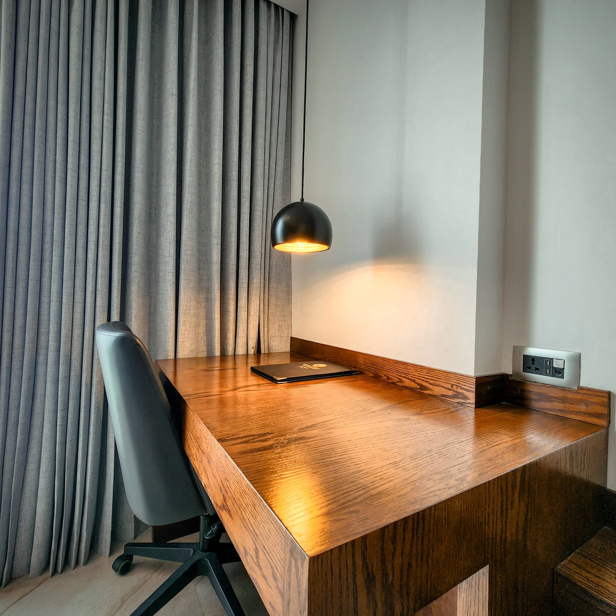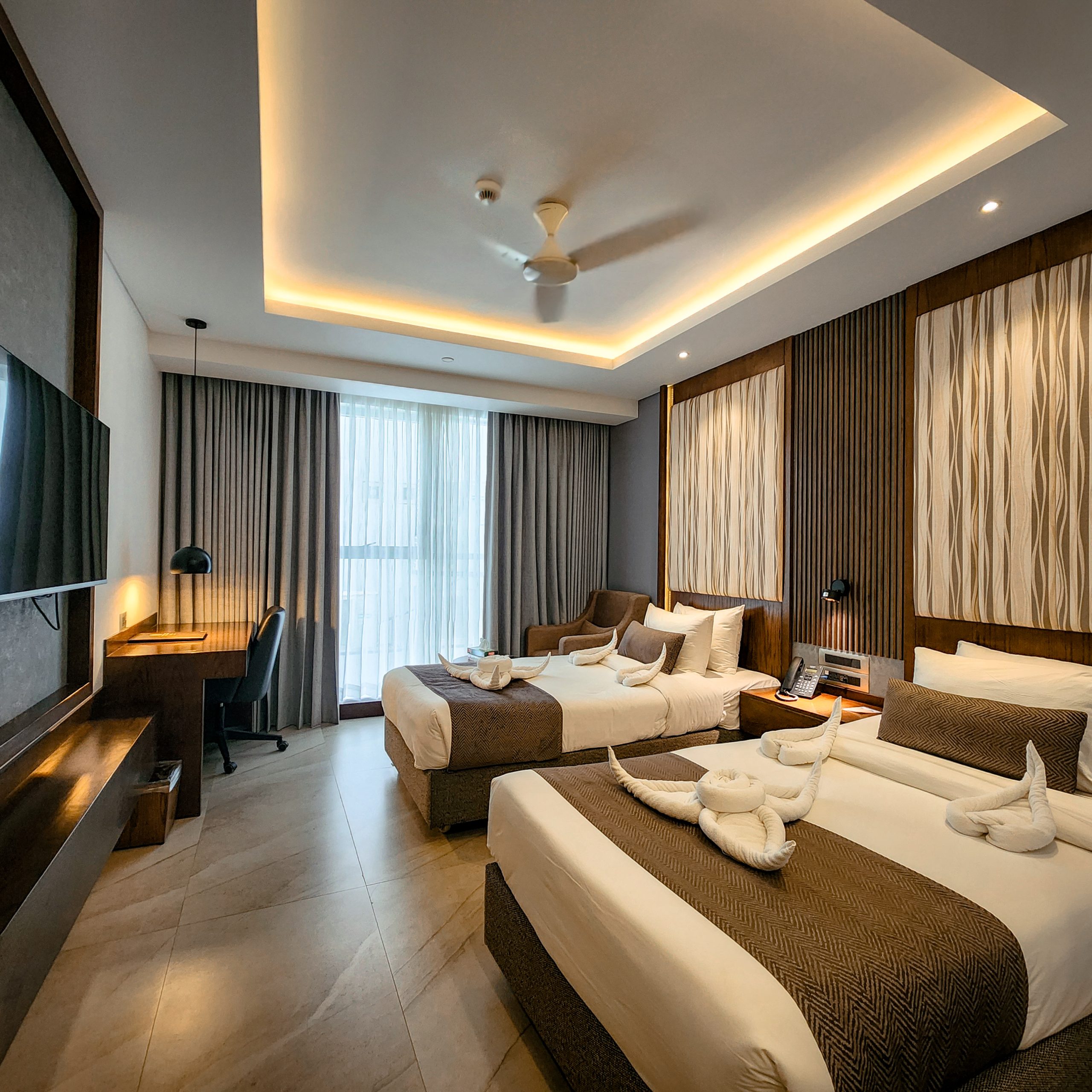 With the aim of making you feel truly comfortable and at home, each room at our hotel is thoughtfully designed in a soothing palette of soft colors. As you step through the doors, a corridor adorned with modern furnishings leads you to a cozy living area featuring a plush sofa, upholstered chair, and a 42-inch LED TV — perfect for unwinding in comfort. For your convenience, a work desk and complimentary high-speed internet access are also provided to keep you connected throughout your stay.