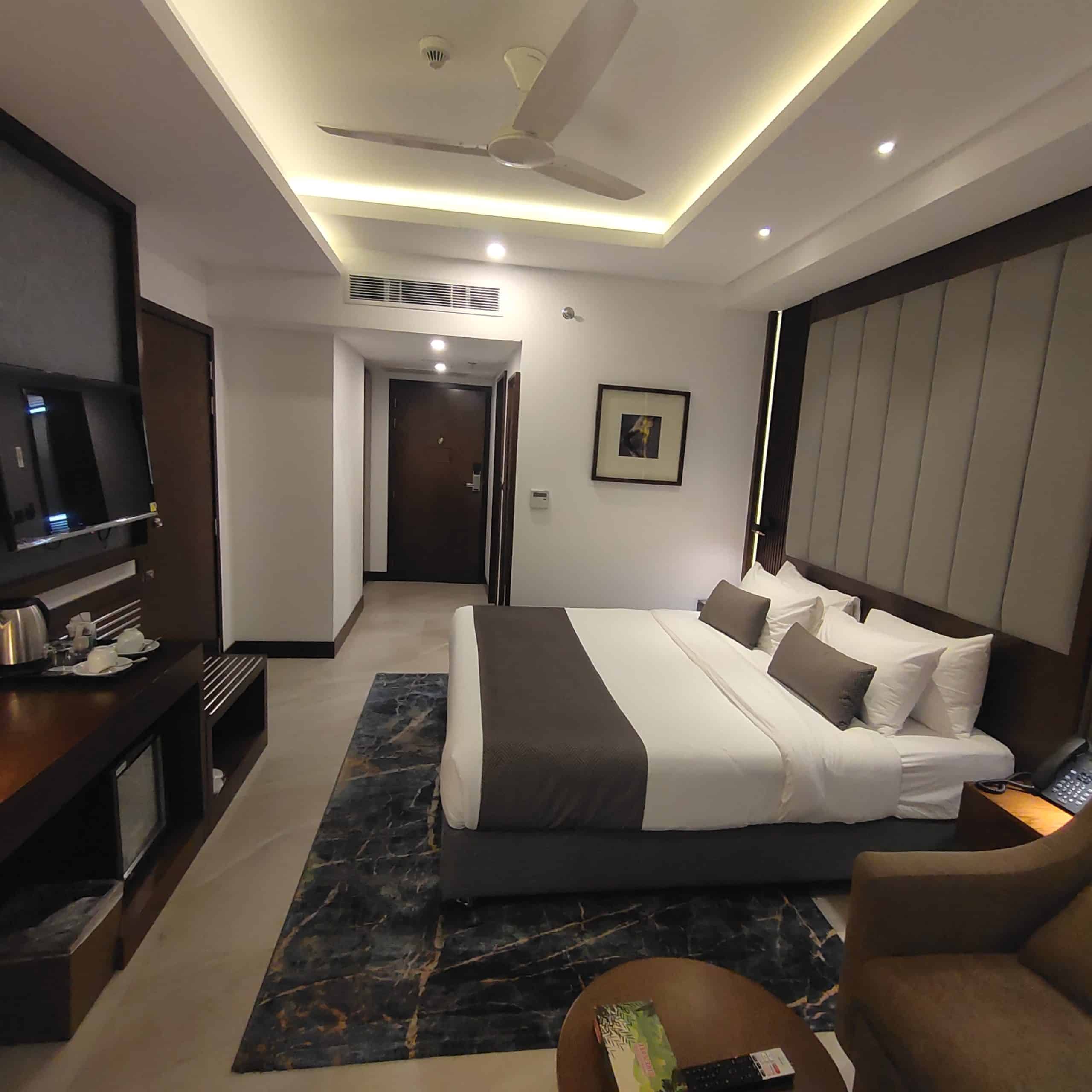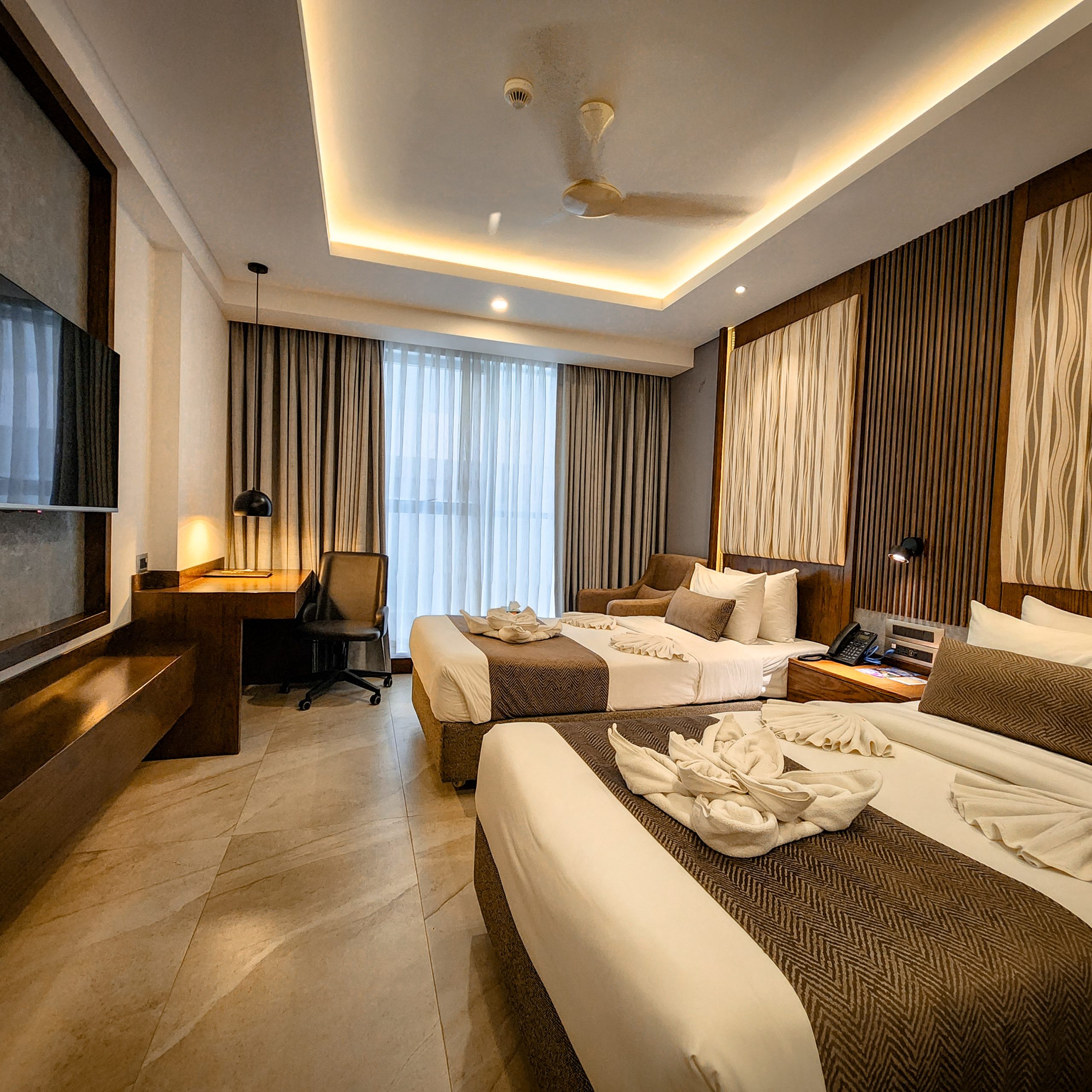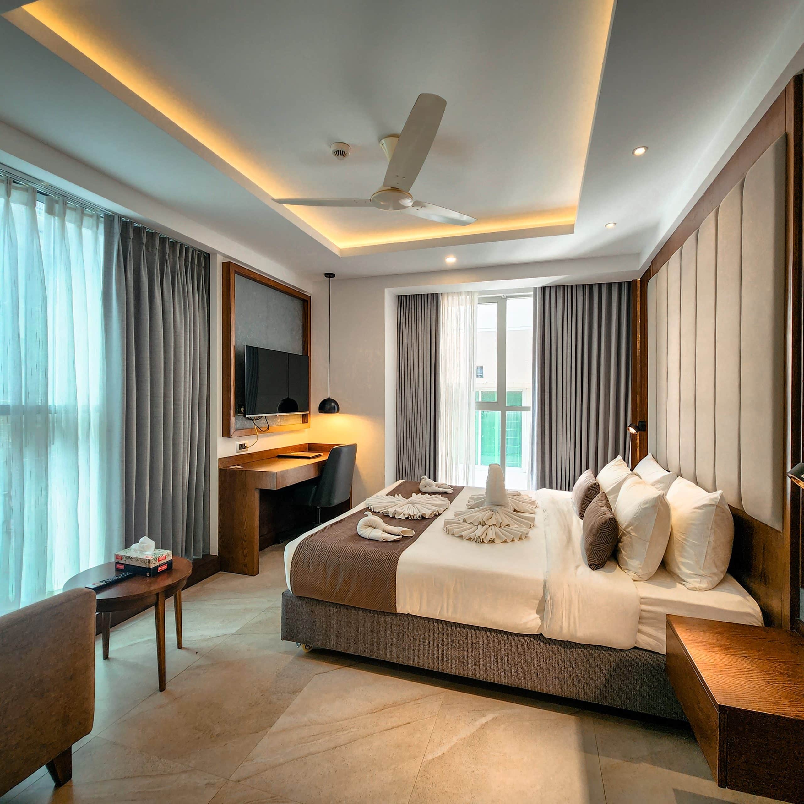 With the aim of making you feel truly comfortable and at home, each room at our hotel is thoughtfully designed in a soothing palette of soft colors. As you step through the doors, a corridor adorned with modern furnishings leads you to a cozy living area featuring a plush sofa, upholstered chair, and a 42-inch LED TV — perfect for unwinding in comfort. For your convenience, a work desk and complimentary high-speed internet access are also provided to keep you connected throughout your stay.