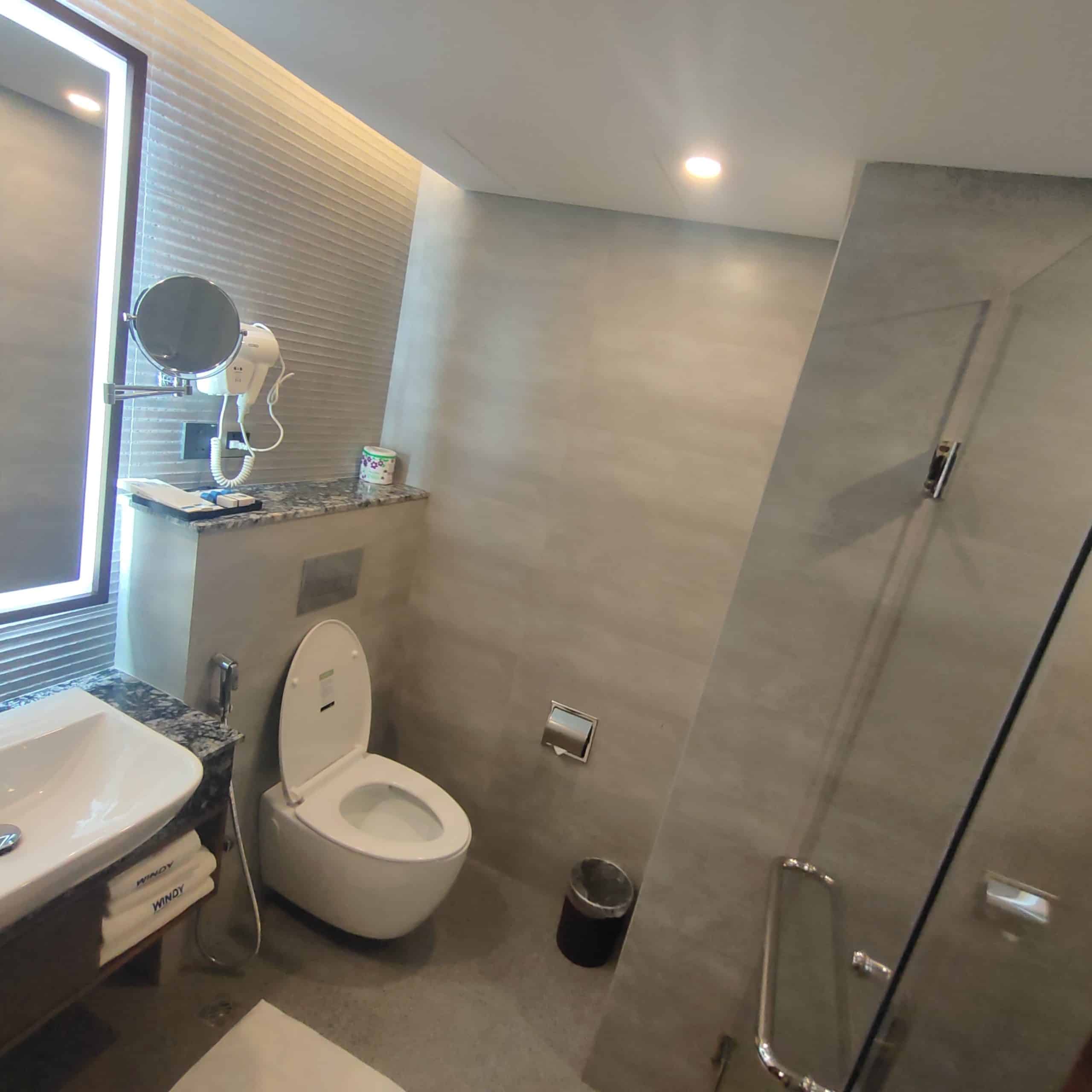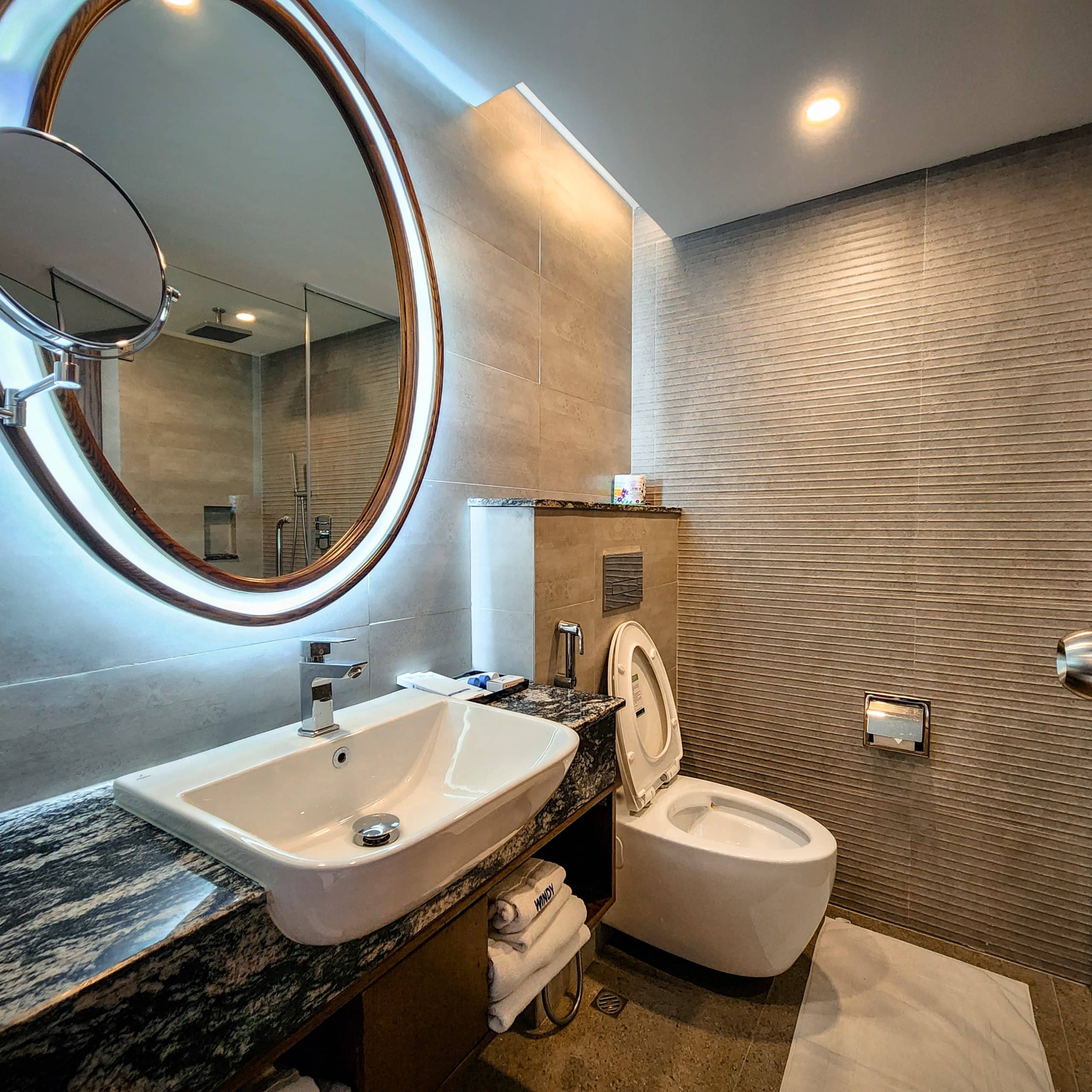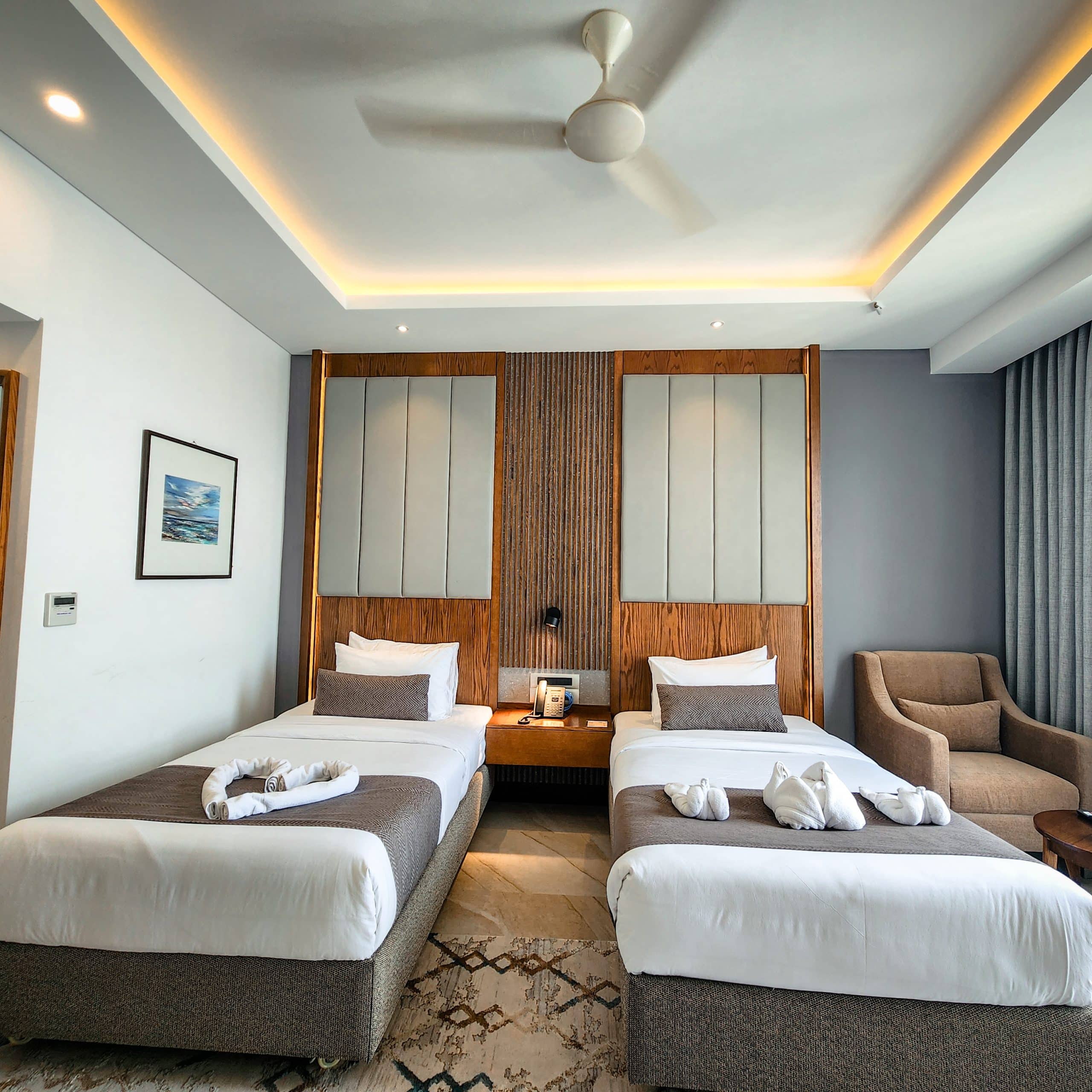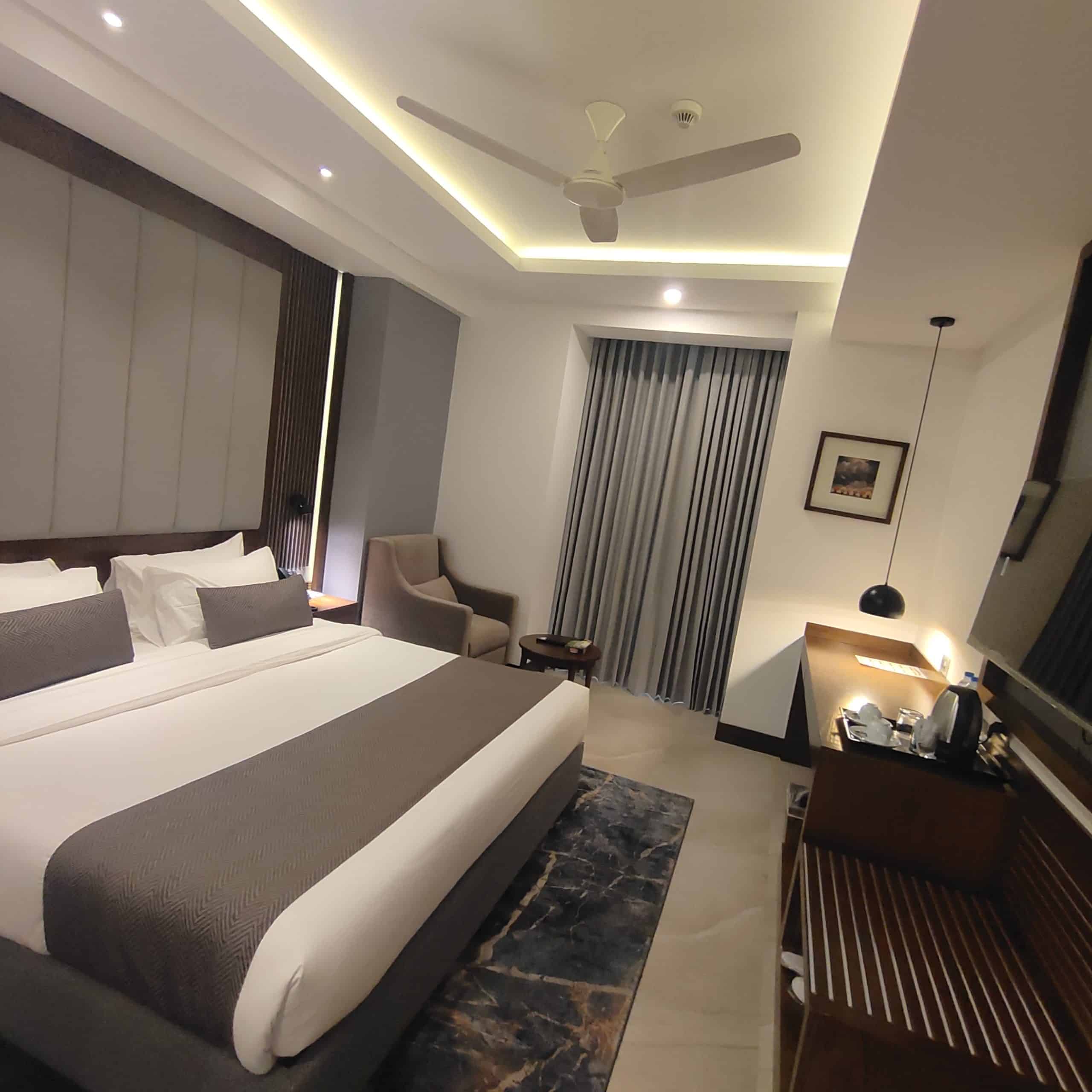 With the aim of making you feel truly comfortable and at home, each room at our hotel is thoughtfully designed in a soothing palette of soft colors. As you step through the doors, a corridor adorned with modern furnishings leads you to a cozy living area featuring a plush sofa, upholstered chair, and a 42-inch LED TV — perfect for unwinding in comfort. For your convenience, a work desk and complimentary high-speed internet access are also provided to keep you connected throughout your stay.